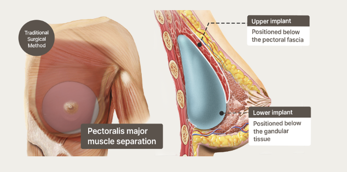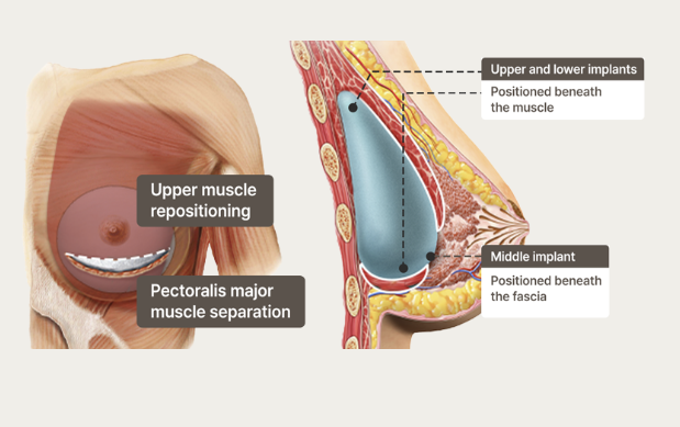 This is WOOA's advanced dual-plane surgery method, which prevents side effects such as the animation deformity that can occur in the dual-plane method. It involves repositioning the inner parts of the upper and lower muscles surrounding the implant, and placing the middle portion of the breast beneath the fascia.